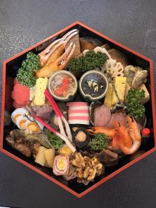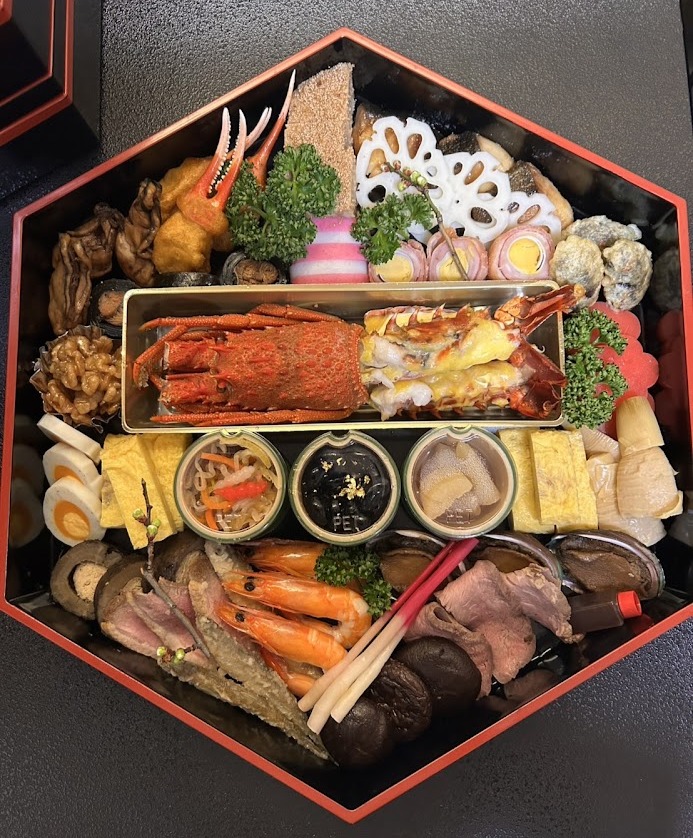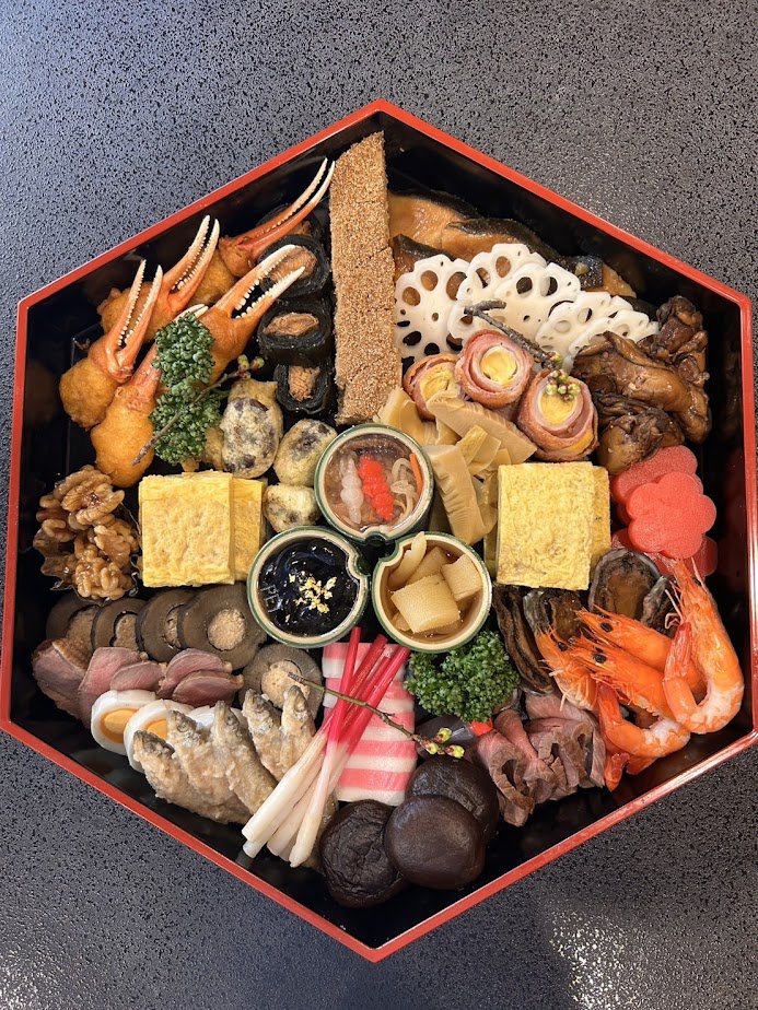 出汁巻き玉子焼き、銀鱈西京焼き、牡蠣辛煮、堀川ごぼう鶏肉鋳込み、ワカサギ南蛮漬け、梅型野菜羹、花蓮根酢漬け、孔雀玉子、とこぶし甘煮、数の子、黒豆、五色なます、竹の子煮しめ、花豆天ぷら、鴨ロース、エビ艶煮、チーズかまぼこ、昆布巻き、はじかみ、カニ爪雲丹揚げ、クルミ蜜煮、紅白かまぼこ、鶏松風焼き、ローストビーフ、どんこ椎茸煮しめ