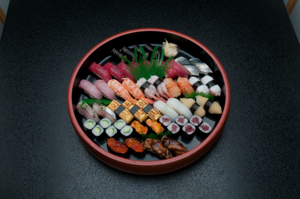 トロ5、カンパチ3、小肌2、エビ3、いか3、たこ2、穴子2、数の子2、いくら3、うに3、赤貝3、玉子2、アジ2、帆立2、干ぴょう巻き、かっぱ巻き、鉄火巻き
