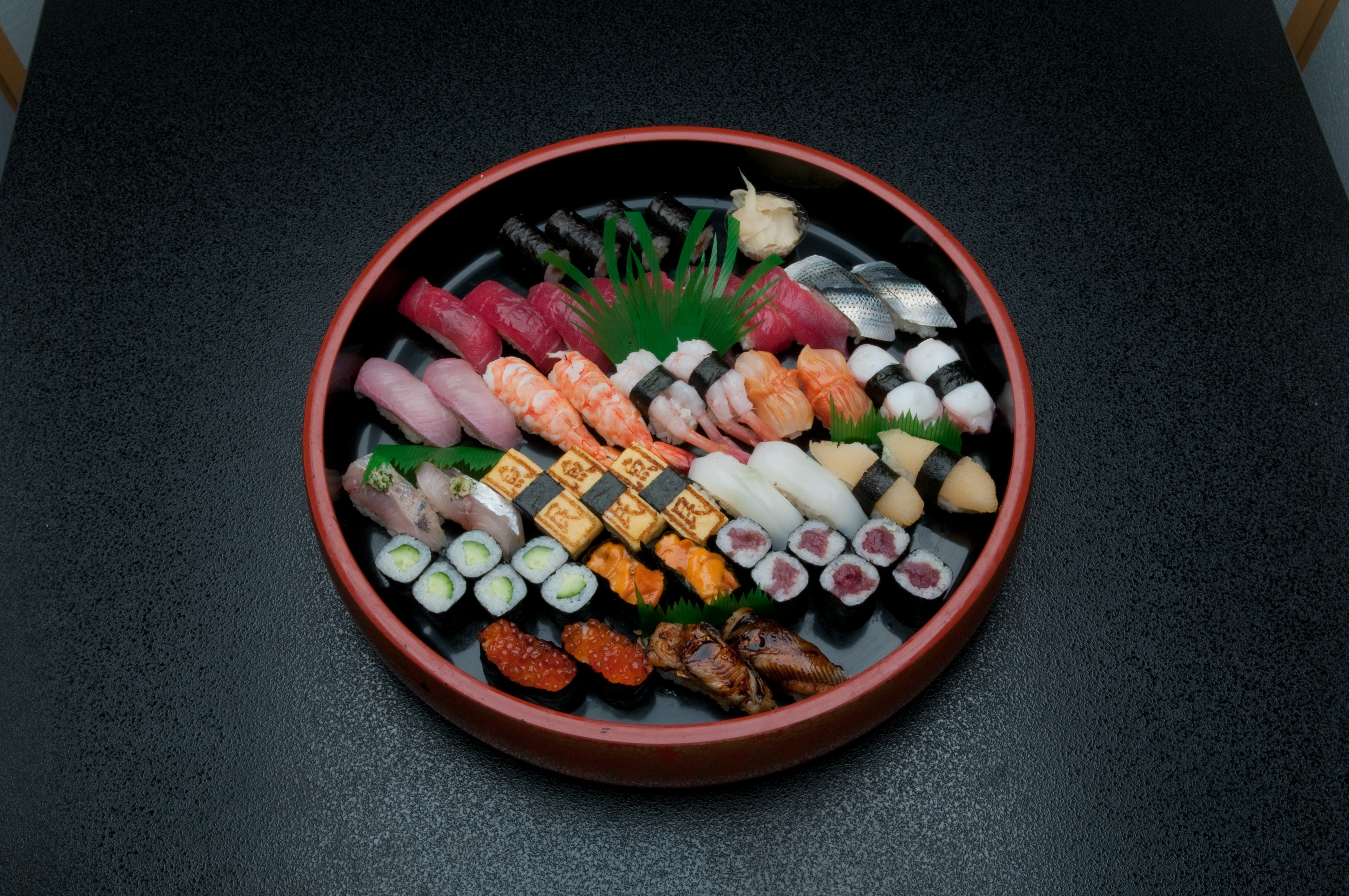 トロ5、かんぱち3、小肌2、エビ3、いか3、たこ2、穴子2、数の子2、いくら2、うに2、平目2、玉子3、アジ2、帆立2、干ぴょう巻き、かっぱ巻き、鉄火巻き