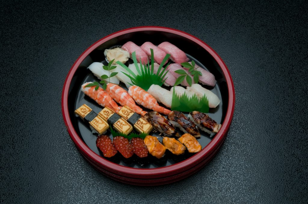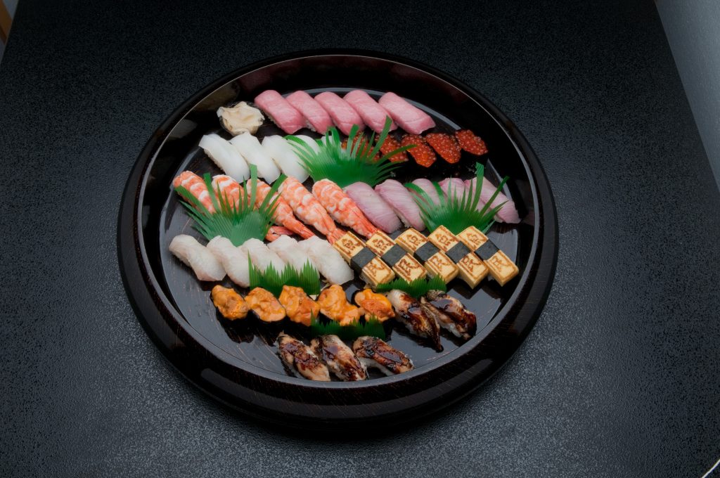 (トロ、いか、いくら、エビ、かんぱち、穴子、平目、玉子、うにの9種類を5貫ずつ)
