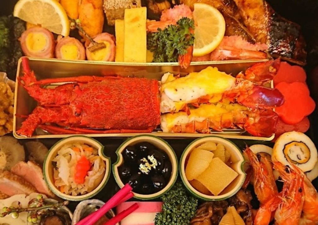 出汁巻き玉子焼き、銀鱈西京焼き、牡蠣辛煮、堀川ごぼう鶏肉鋳込み、ワカサギ南蛮漬け、梅型野菜羹、花蓮根酢漬け、孔雀玉子、とこぶし甘煮、数の子、黒豆、五色なます、竹の子煮しめ、花豆天ぷら、鴨ロース、エビ艶煮、チーズかまぼこ、昆布巻き、はじかみ、カニ爪雲丹揚げ、クルミ蜜煮、紅白かまぼこ、鶏松風焼き、ローストビーフ、どんこ椎茸煮しめ
